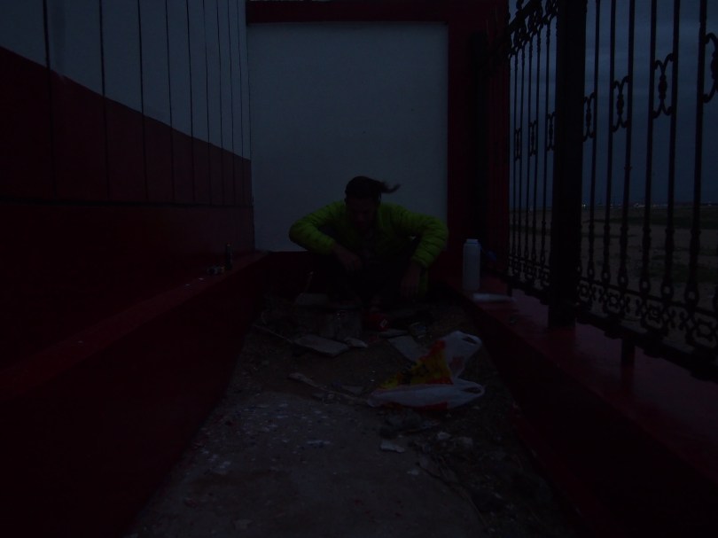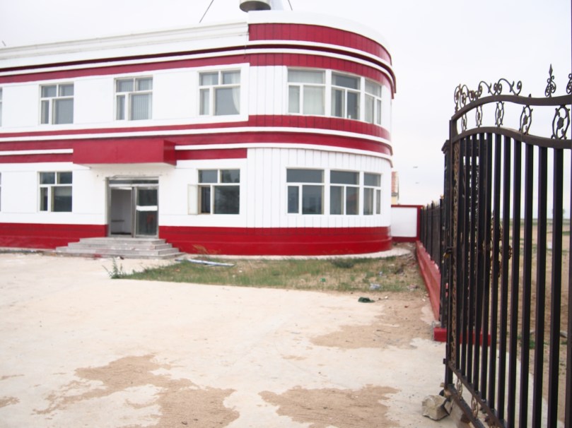 How did we get here? We biked for many miles out of Erenhot, still a part of the Gobi, but today uniquely windy and sunless. Dark clouds loomed. Fed up with the gusts, we pulled aside at a sandy lot, in front of a dim shop to which the stairs had been destroyed or never built. The lot looked like a construction area, but the tracks weren’t clearly from cars or from bulldozers. We might have thought the shop was closed if we weren’t so accustomed to these run down places sparing electricity. We climbed onto the patio and entered the shop, and, being inside, lost the heart to bear with the wind any longer. With hand motions we asked the old shopkeeper if we could set up our tent out front. At first he ignored us, but with some pleading, he beckoned us to follow. Out of the dirt he brought us next door to a locked gate, large and ornate like that of a manor, complete with gold trim and fresh red paint (noted from the paint stains we saw on the grass). In the courtyard there was a small tree and two dilapidated buildings. One looked like a residence and was a bit further.