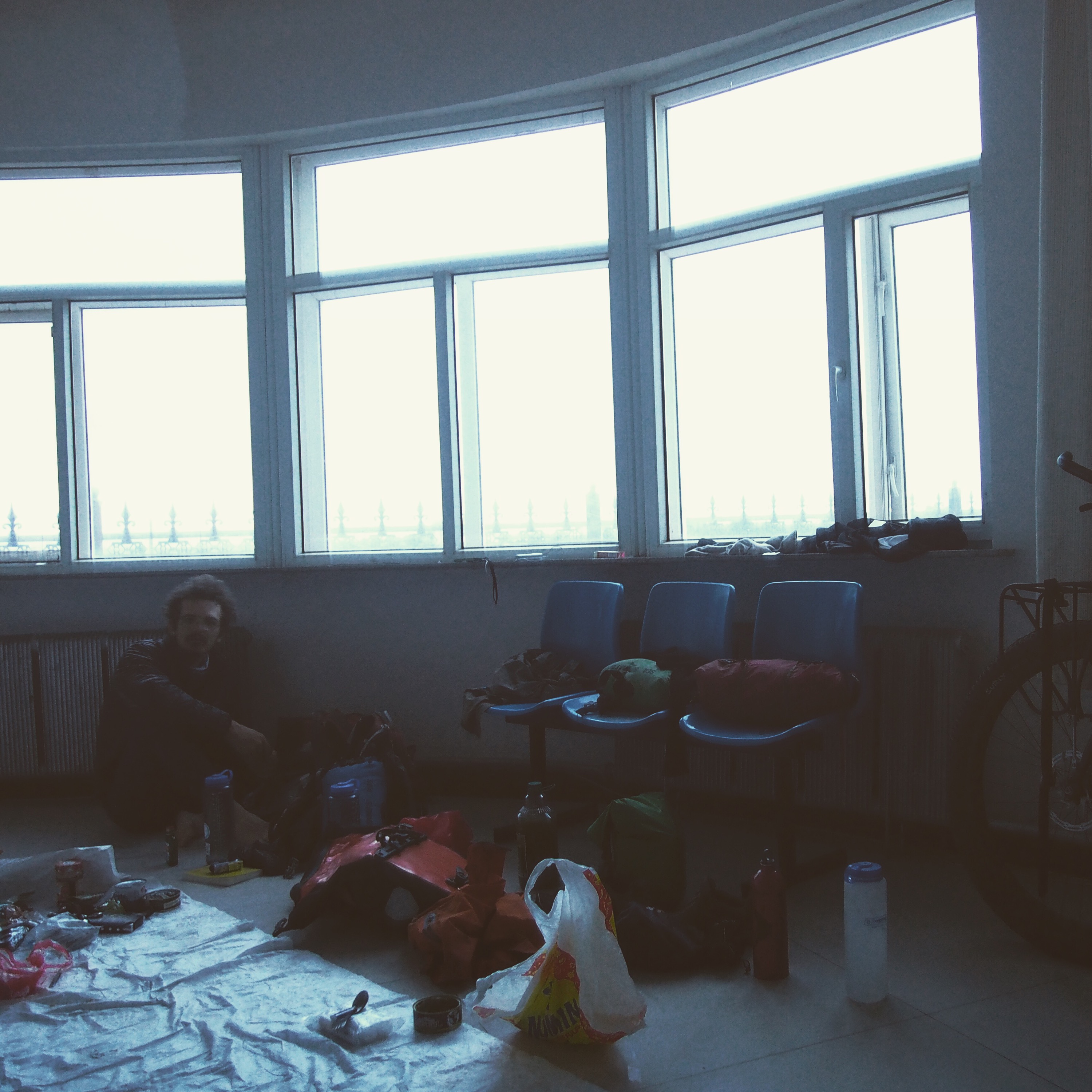 With our bikes, we followed our shelterer, who bore a sweet but uncomfortable smile, through the shattered door, stepping through its empty frame. Inside was somber. Translucent plastic drapes, the kind you might see in a quarantine tent, separated the entry hall from the main hall. We pushed these aside to find the bright red banner underneath which we rested our bikes. The old man showed us to our office and left us on our own with a shy grin and a bow.