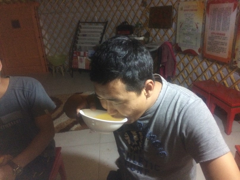 On the fateful first night they stuffed us with bread, sour grasses picked from the fields, potatoes, broccoli and lamb. Then put us on a steady drip of beer, which led to songs and laughter, then baiju (Chinese rice wine), then a morning of nausea.